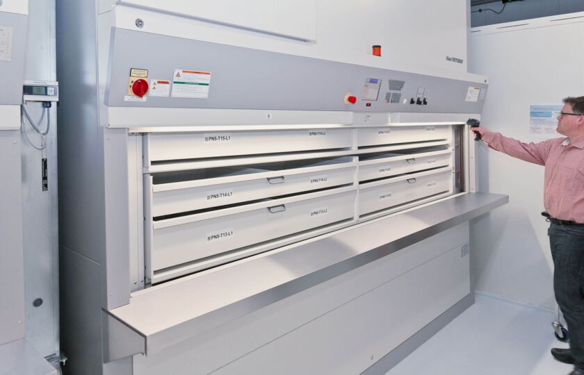Die Handhabung der bis zu 50’000 ArzneiRückstellmuster am Standort Bern erfolgte bis dato manuell. Um das Handling und gleichzeitig die Lagerplatzknappheit zu verbessern, wurde im Jahr 2014 das Projekt «QC-RML» zur durchgehenden Modernisierung des Lagersystems gestartet. Die variablen Abmessungen der Arznei-Rückstellmuster und die umfangreiche Menge erforderten ein grosses Fassungsvermögen mit hoher Variabilität. CSL Behring suchte eine Lösung mit geringem Aufwand, welche die regulatorischen Anforderungen erfüllt und den Aufwand der Bewirtschaftung reduziert. Die Hard- und Softwaresysteme, welche die Lagerdaten verarbeiten und protokollieren sollten, mussten nach GMP validiert werden. Das neue Lager besteht aus sechs Paternostersystemen, jeweils ausgestattet mit 12 Tragsätzen. Jeder ist in vier Schubladen aufgeteilt, jeweils bestückt mit zwei Blistern für unverpackte Flaschen oder für Flaschen in Verpackung. Total stehen ca. 70’000 Lagerplätze zur Verfügung. Die Herausforderung für die Lagerverwaltungssoftware war nicht nur die grosse Anzahl an Plätzen, sondern auch die gleichmässige Gewichtsverteilung der Objekte in den sechs Paternostern.